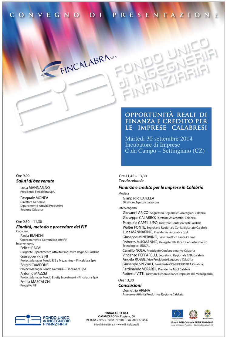 Martedì 30 settembre presso l’Incubatore di Imprese di Settingiano (CZ) a partire dalle ore 9.00 sarà presentato il Fondo Unico di Ingegneria Finanziaria, l’innovativo programma di sostegno alle imprese promosso dal Dipartimento Attività Produttive della Regione Calabria di cui Fincalabra è soggetto gestore.