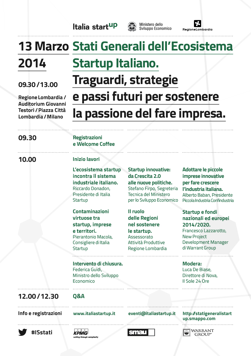 L’iniziativa è promossa dall’associazione Italia Startup insieme a Ministero dello Sviluppo Economico, Regione Lombardia e Piccola Industria Confindustria. L’incontro sarà l’occasione per fare il punto sulle iniziative che verranno messe in atto nei prossimi mesi dal Governo Renzi: in particolare, c’è grande attesa in riferimento alle agevolazioni fiscali per chi investe in startup, divenute esecutive dopo la firma dell’ex ministro Saccomanni, e al fondo di garanzia per chi investire in micro imprese dall’alto contenuto tecnologico e di innovazione. Durante la giornata vi sarà inoltre un focus sulle opportunità date dai fondi UE per il settennato 2014-2020 grazie al contributo di Warrant Group, società specializzata nella finanza d’impresa e di internazionalizzazione.