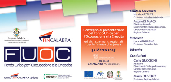 Martedì 31 marzo presso la sede di Unindustria a Catanzaro alle ore 11,00 l’Assessore allo Sviluppo Economico, Lavoro e Politiche Sociali della Regione Calabria, Carlo Guccione, presenterà il FUOC – Fondo Unico per l’Occupazione e la Crescita.Il FUOC vuole essere una risposta concreta alla domanda di occupazione, per creare occasioni di lavoro regolare e stabile, anche nel settore delle imprese private, attraverso la facilitazione dell’accesso al credito da parte dei soggetti destinatari e delle imprese che assumono.